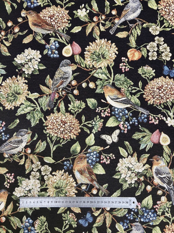 Mustriline gobeläänkangas naturaalse kiu sisaldusega (58% puuvill/ 32% polüester / 10% akrüül)